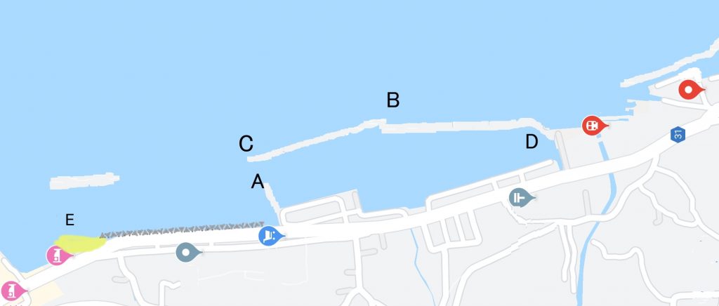 Aポイントは小波止になっており意外によく釣れる。メバルやアオリイカなどが有望。Cポイントは渡船を利用して渡る。チヌや青物など大型の魚影も濃いポイント。C,Bポイントとも足下には注意が必要。Eポイント横の消波ブロック周辺には根魚の魚影が濃く、ヒラメを狙ってルアーを投げるのも面白い。